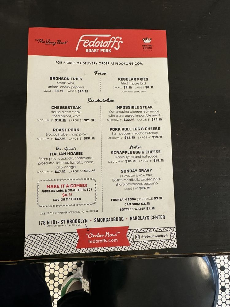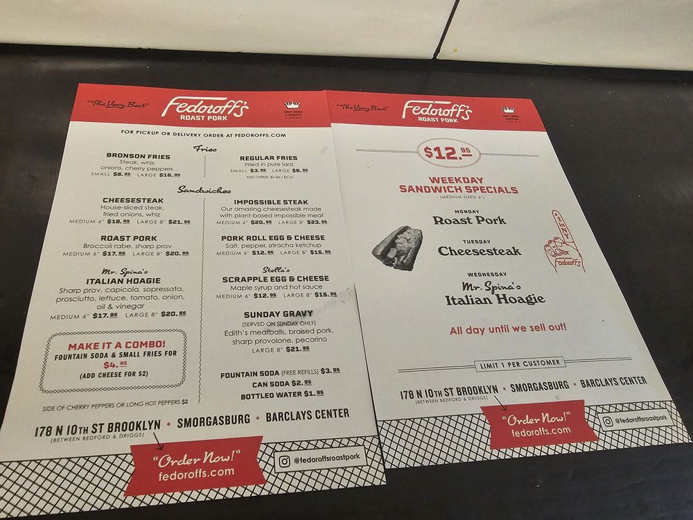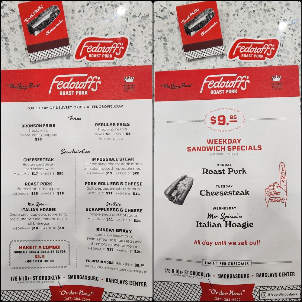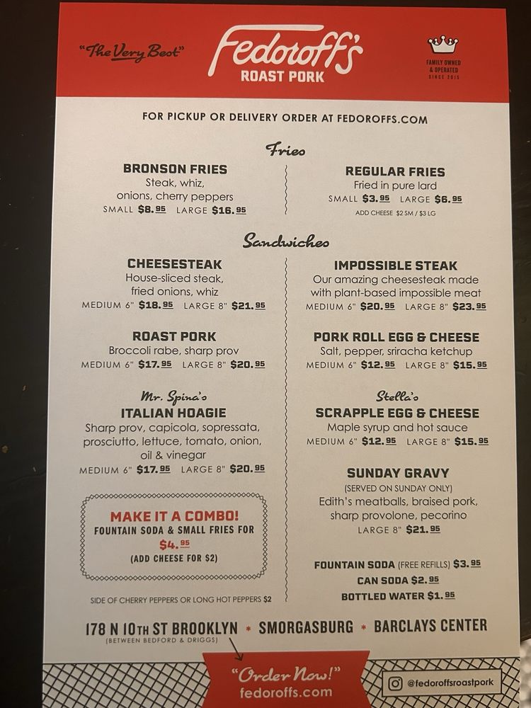 Fedoroff's Roast Pork is a cozy spot in Brooklyn known for its delicious roast pork and cheesesteak sandwiches. The menu features specialties like the Italian Hoagie with thinly sliced soppressata, capicola, and sharp provolone. Customers rave about the flavorful Sunday Gravy sandwich and the loaded Bronson fries. The vintage Yerba Mate soda is a unique and highly revitalizing option. While the prices may be on the higher end, the quality of the food makes it worth it. The restaurant has a small, vintage diner feel with limited seating, so it's best for solo or small group dining. Overall, Fedoroff's Roast Pork is a must-visit for any sandwich enthusiast looking for a tasty and satisfying meal in Brooklyn.