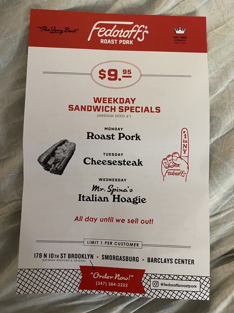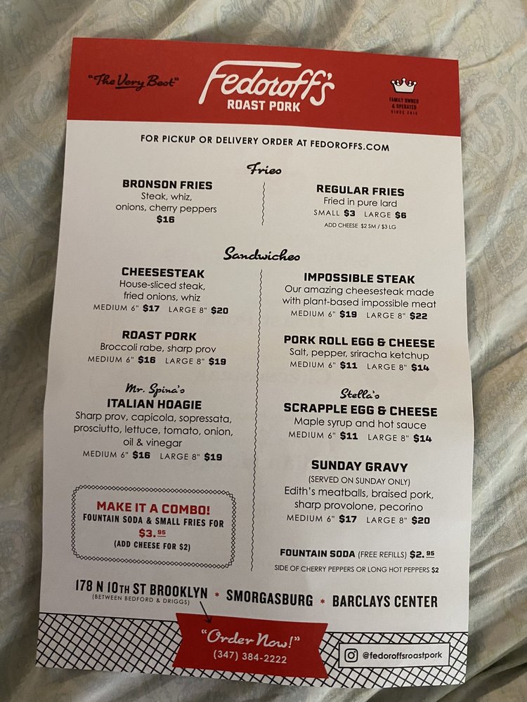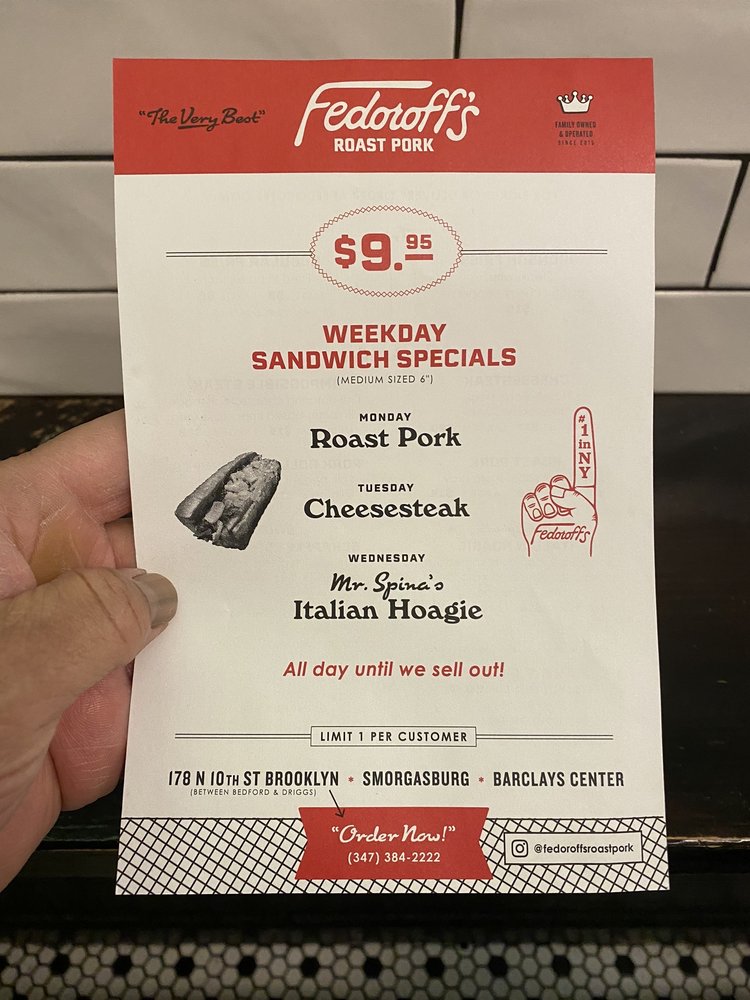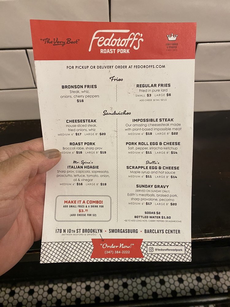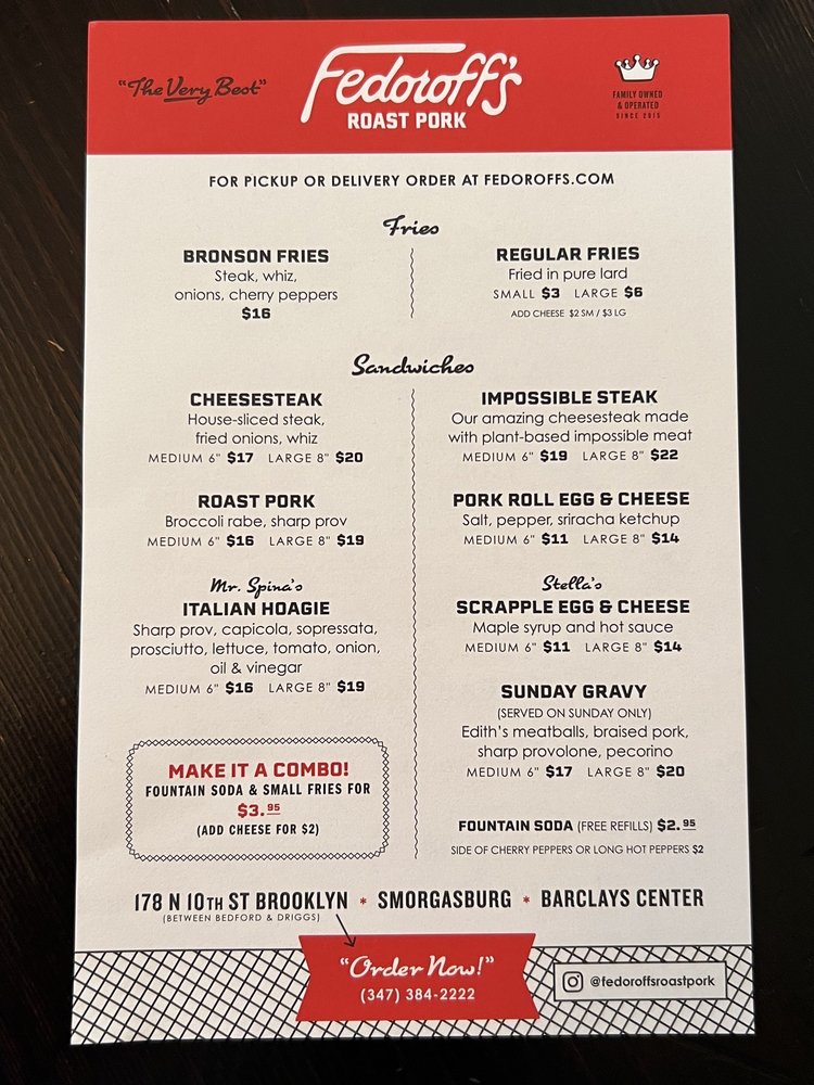 Fedoroff's Roast Pork is a cozy spot in Brooklyn known for its delicious roast pork and cheesesteak sandwiches. The menu features specialties like the Italian Hoagie with thinly sliced soppressata, capicola, and sharp provolone. Customers rave about the flavorful Sunday Gravy sandwich and the loaded Bronson fries. The vintage Yerba Mate soda is a unique and highly revitalizing option. While the prices may be on the higher end, the quality of the food makes it worth it. The restaurant has a small, vintage diner feel with limited seating, so it's best for solo or small group dining. Overall, Fedoroff's Roast Pork is a must-visit for any sandwich enthusiast looking for a tasty and satisfying meal in Brooklyn.